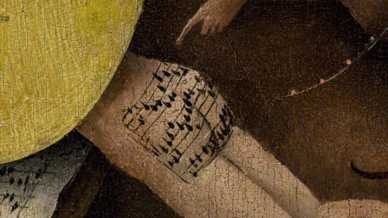 It’s a brief, chant-like melody. Not a hidden opus—just Bosch’s joke about sin sounding off.
